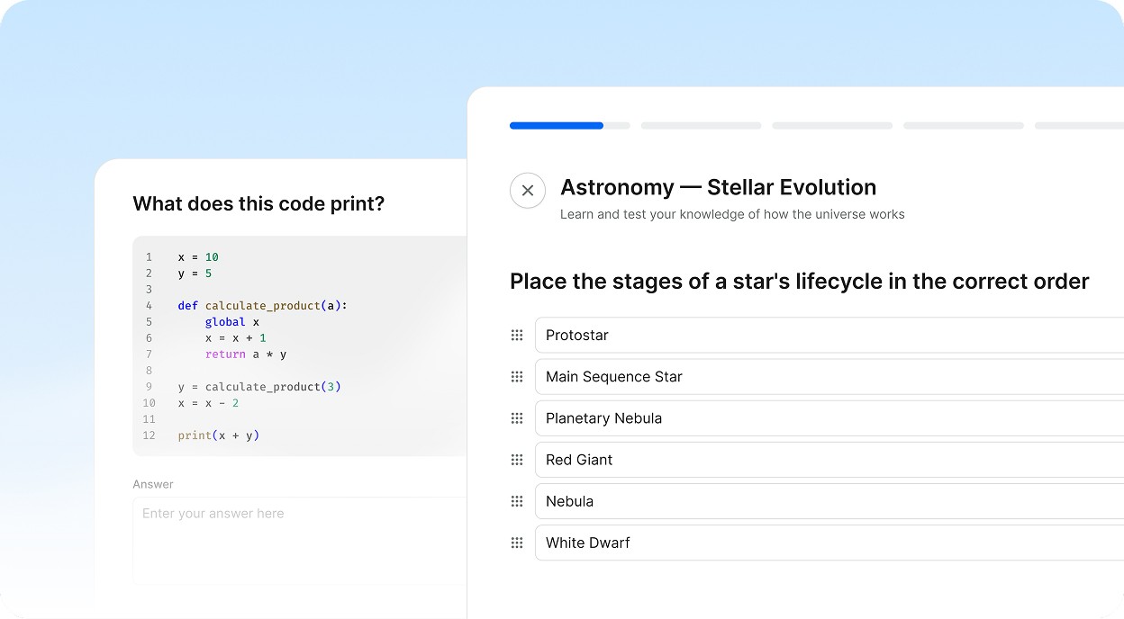 Adaptive problem sets built from your gaps. Every question is designed to help you improve exactly where it matters.